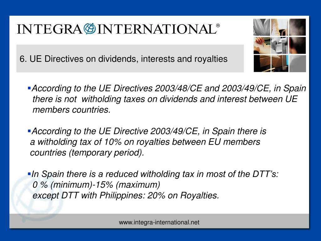 6. UE Directives on dividends, interests and royalties • According to the UE Directives 2003/48/CE and2003/49/CE, in Spain there is not witholding taxes on dividends and interestbetween UE members countries. • According to the UE Directive 2003/49/CE, in Spain there is a witholding tax of 10% on royalties between EU members countries (temporary period). • In Spain there is a reduced witholding tax in most of the DTT’s: 0 % (minimum)-15% (maximum) except DTT with Philippines: 20% on Royalties.