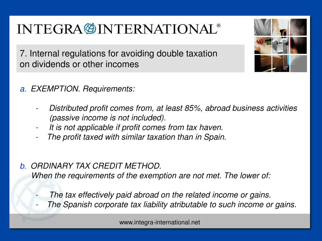 7. Internal regulations for avoiding double taxation on dividends or other incomes • EXEMPTION. Requirements: • Distributed profit comes from, at least 85%, abroad business activities • (passive income is not included). • It is not applicable if profit comes from tax haven. • The profit taxed with similar taxation than in Spain. • ORDINARY TAX CREDIT METHOD. • When the requirements of the exemption are not met. The lower of: • The tax effectively paid abroad on the related income or gains. • The Spanish corporate tax liability atributable to such income or gains.