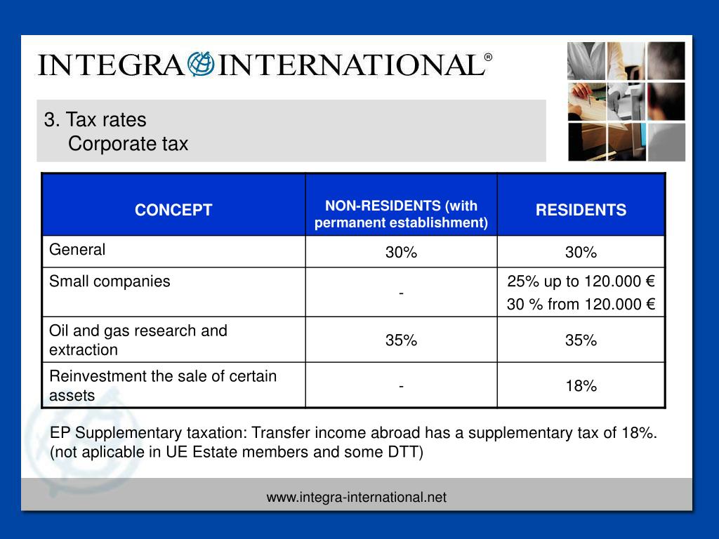 3. Tax rates Corporate tax EP Supplementary taxation: Transfer income abroad has a supplementary tax of 18%. (not aplicable in UE Estate members and some DTT)