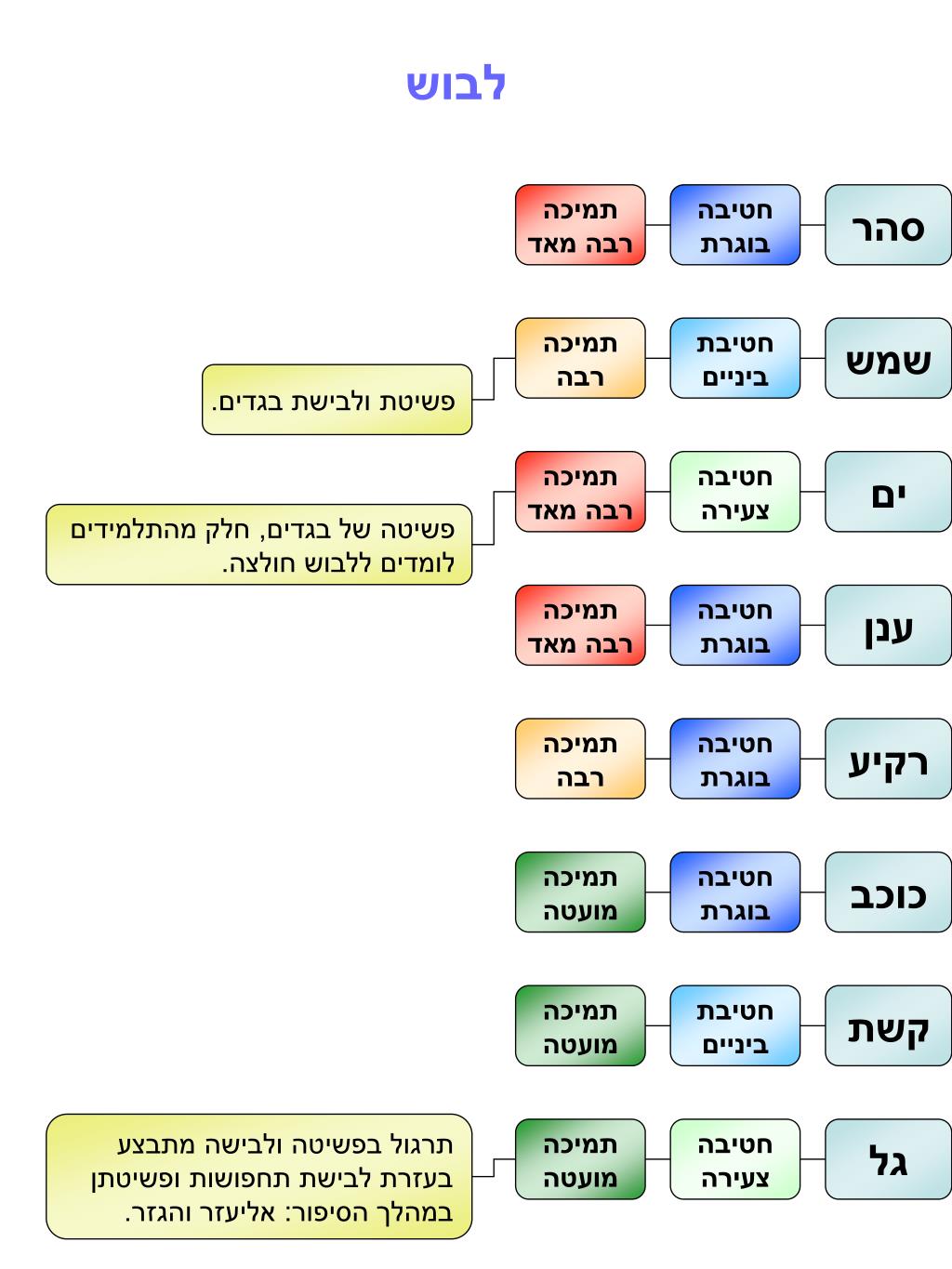 לבוש תמיכה רבה מאד חטיבה בוגרת סהר תמיכה רבה חטיבת ביניים שמש פשיטת ולבישת בגדים. תמיכה רבה מאד חטיבה צעירה ים פשיטה של בגדים, חלק מהתלמידים לומדים ללבוש חולצה. תמיכה רבה מאד חטיבה בוגרת ענן תמיכה רבה חטיבה בוגרת רקיע תמיכה מועטה חטיבה בוגרת כוכב תמיכה מועטה חטיבת ביניים קשת תרגול בפשיטה ולבישה מתבצע בעזרת לבישת תחפושות ופשיטתן במהלך הסיפור: אליעזר והגזר. תמיכה מועטה חטיבה צעירה גל