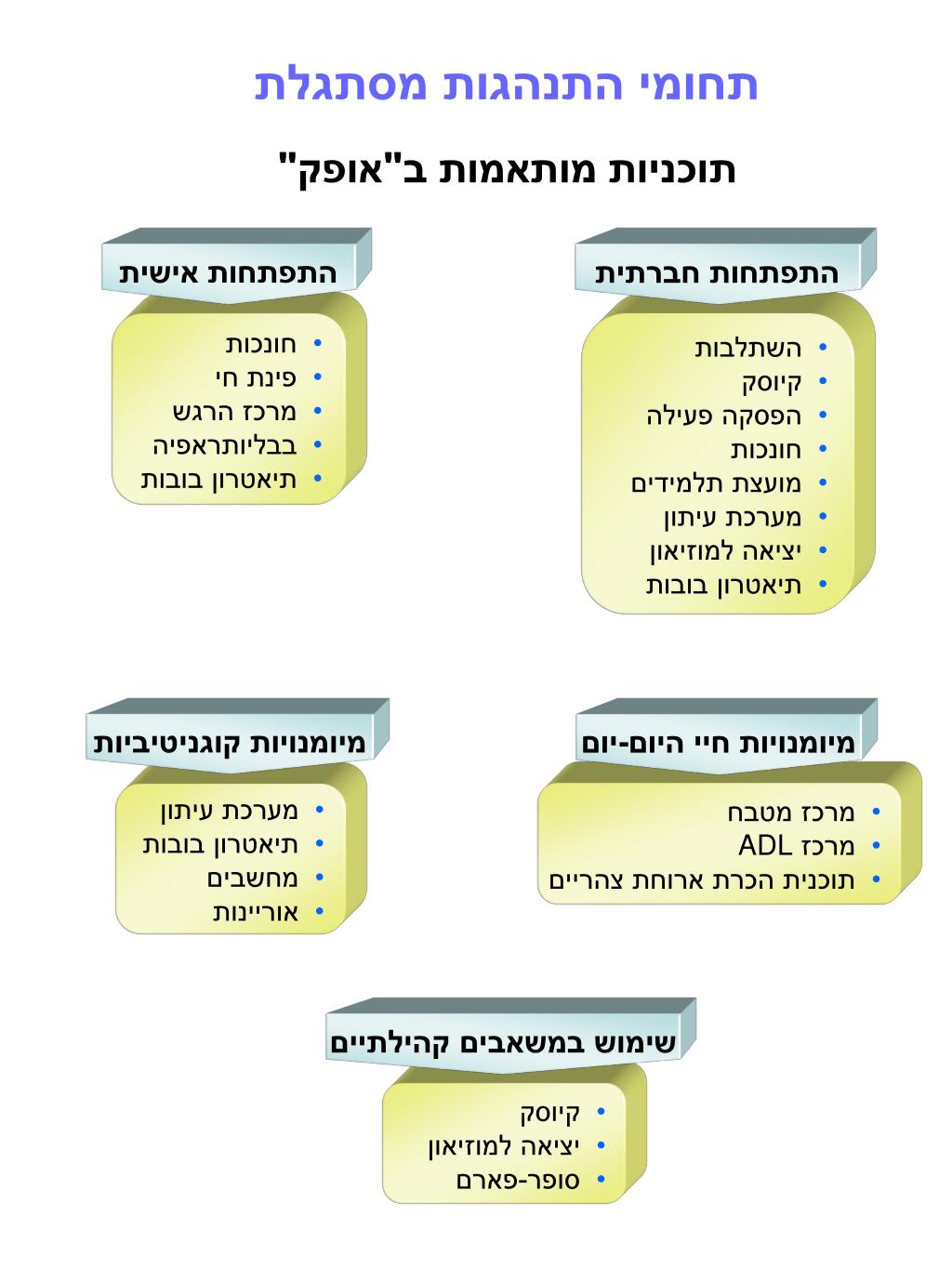מרכזים תפקודיים ב"אופק" יעדים מטרות ADL רכישת מיומנויות הקשורות לתפקודי היום-יום • פתוח ותרגול מיומנויות ניקיון אישי • פיתוח מיומנויות הקשורות ללבוש • שימוש במכשירים • יציאה לקהילה תעסוקה הכשרת התלמיד להשתלבות במרכזי עבודה מוגנים • הקניית מיומנויות טכניות בסיסיות • הקניית מיומנויות בסיסיות בתחום הקוגניטיבי • התנסויות בעבודות פשוטות • הכנה ליציאה לעבודה בקהילה או במסגרת מוגנת מטבח לימוד אכילה עצמאית, לימוד תפקוד עצמאי בסיסי במטבח • הכנת מזון • שימוש במכשירים • עריכת שולחן ופינוי שולחן