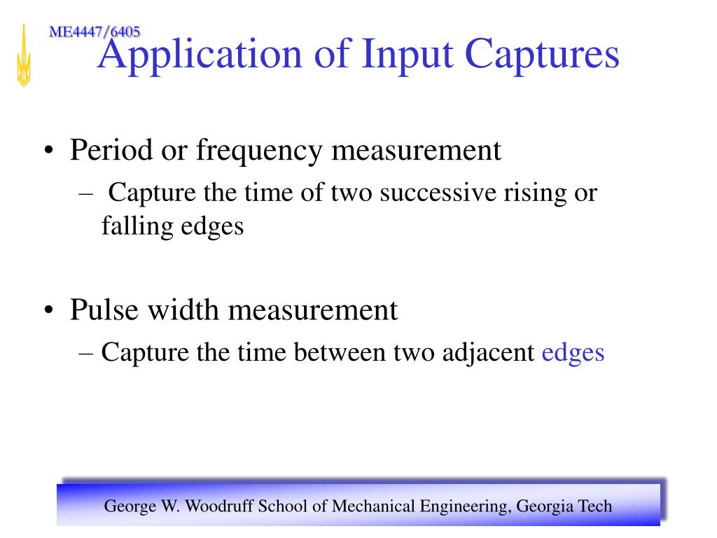 Period or frequency measurement Capture the time of two successive rising or falling edges Pulse width measurement Capture the time between two adjacent edges Application of Input Captures
