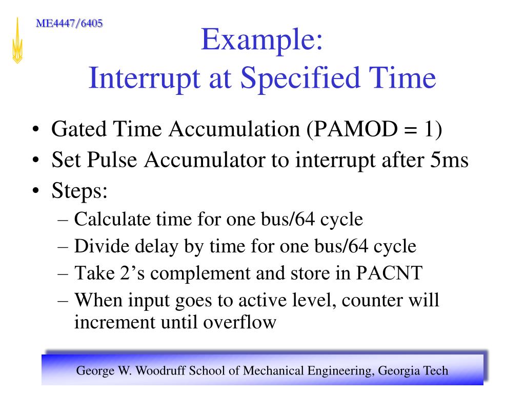 Gated Time Accumulation (PAMOD = 1) Set Pulse Accumulator to interrupt after 5ms Steps: Calculate time for one bus/64 cycle Divide delay by time for one bus/64 cycle Take 2’s complement and store in PACNT When input goes to active level, counter will increment until overflow Example:Interrupt at Specified Time