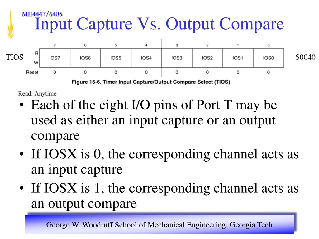 Each of the eight I/O pins of Port T may be used as either an input capture or an output compare If IOSX is 0, the corresponding channel acts as an input capture If IOSX is 1, the corresponding channel acts as an output compare Input Capture Vs. Output Compare TIOS $0040