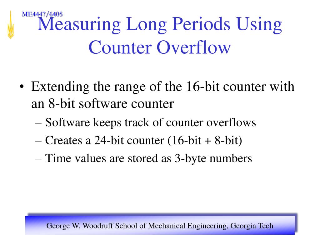 Extending the range of the 16-bit counter with an 8-bit software counter Software keeps track of counter overflows Creates a 24-bit counter (16-bit + 8-bit) Time values are stored as 3-byte numbers Measuring Long Periods Using Counter Overflow