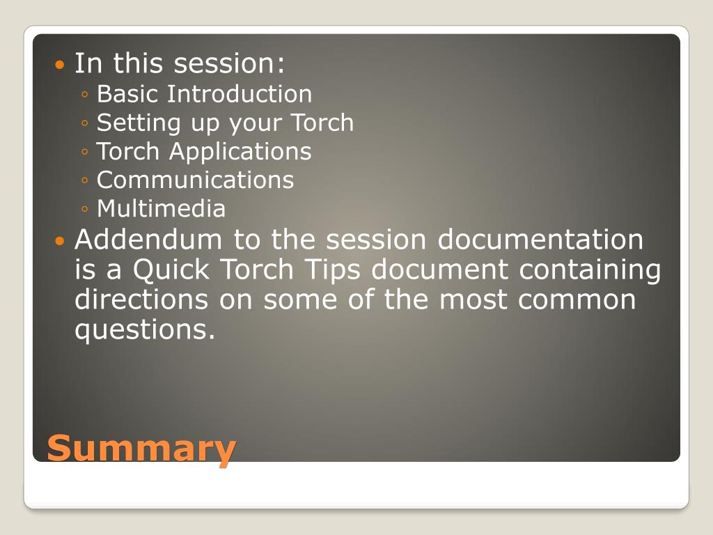 In this session: • Basic Introduction • Setting up your Torch • Torch Applications • Communications • Multimedia • Addendum to the session documentation is a Quick Torch Tips document containing directions on some of the most common questions. Summary