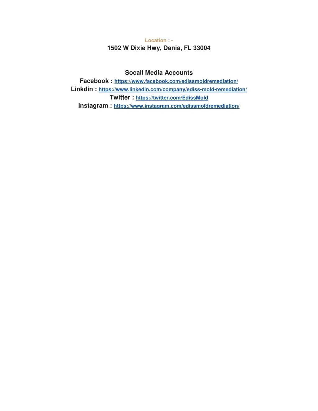 Location : - 1502 W Dixie Hwy, Dania, FL 33004 Socail Media Accounts Facebook : https://www.facebook.com/edissmoldremediation/ Linkdin : https://www.linkedin.com/company/ediss-mold-remediation/ Twitter : https://twitter.com/EdissMold Instagram : https://www.instagram.com/edissmoldremediation/