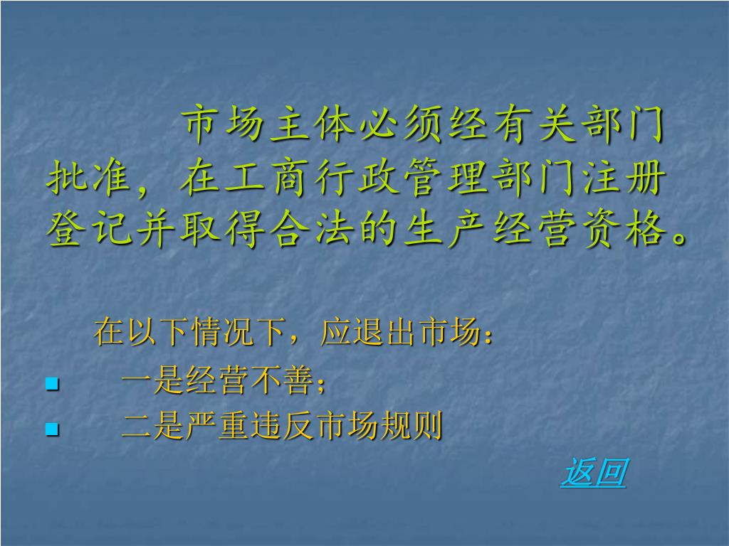 市场主体必须经有关部门批准,在工商行政管理部门注册登记并取得合法的生产经营资格。市场主体必须经有关部门批准,在工商行政管理部门注册登记并取得合法的生产经营资格。 在以下情况下,应退出市场: • 一是经营不善; • 二是严重违反市场规则 返回