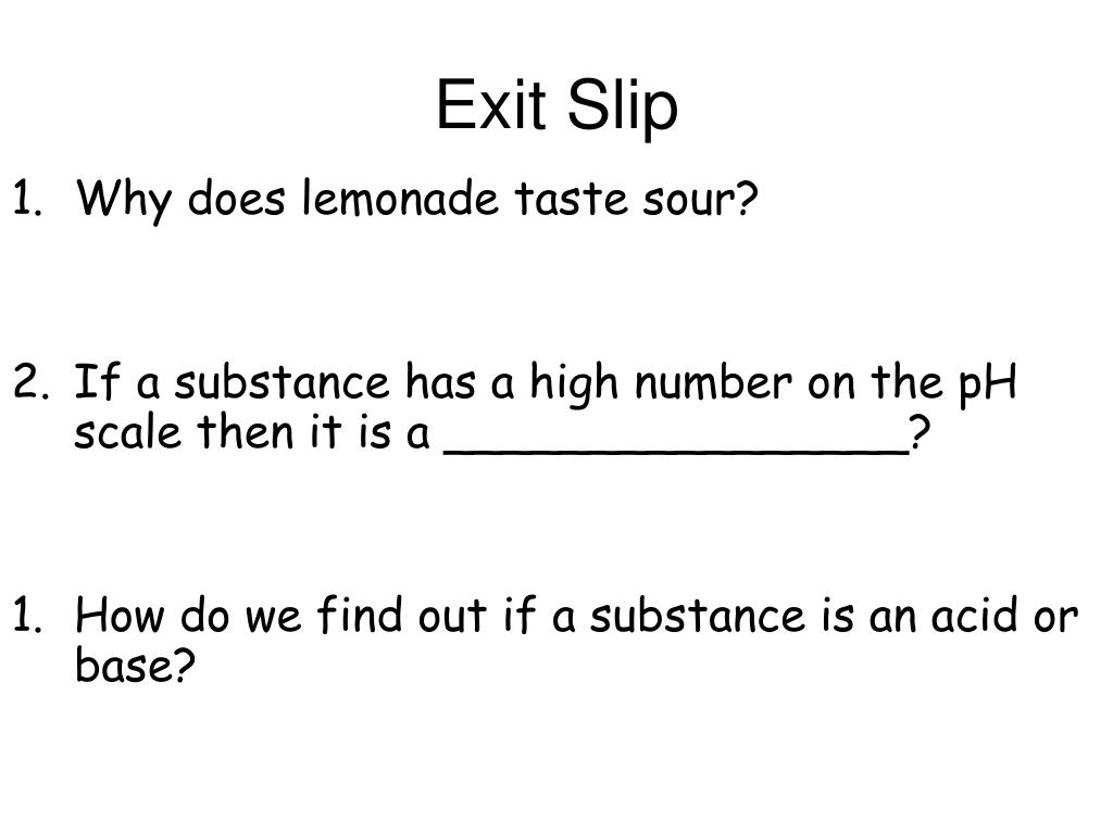 Exit Slip • Why does lemonade taste sour? • If a substance has a high number on the pH scale then it is a ________________? • How do we find out if a substance is an acid or base?