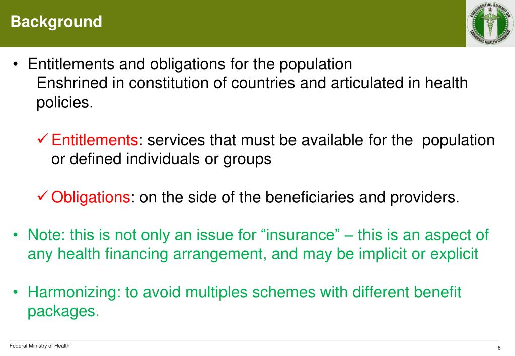 Background • Entitlements and obligations for the population • Enshrined in constitution of countries and articulated in healthpolicies. • Entitlements: services that must be available for the population or defined individuals or groups • Obligations: on the side of the beneficiaries and providers. • Note: this is not only an issue for “insurance” – this is an aspect of any health financing arrangement, and may be implicit or explicit • Harmonizing: to avoid multiples schemes with different benefit packages.