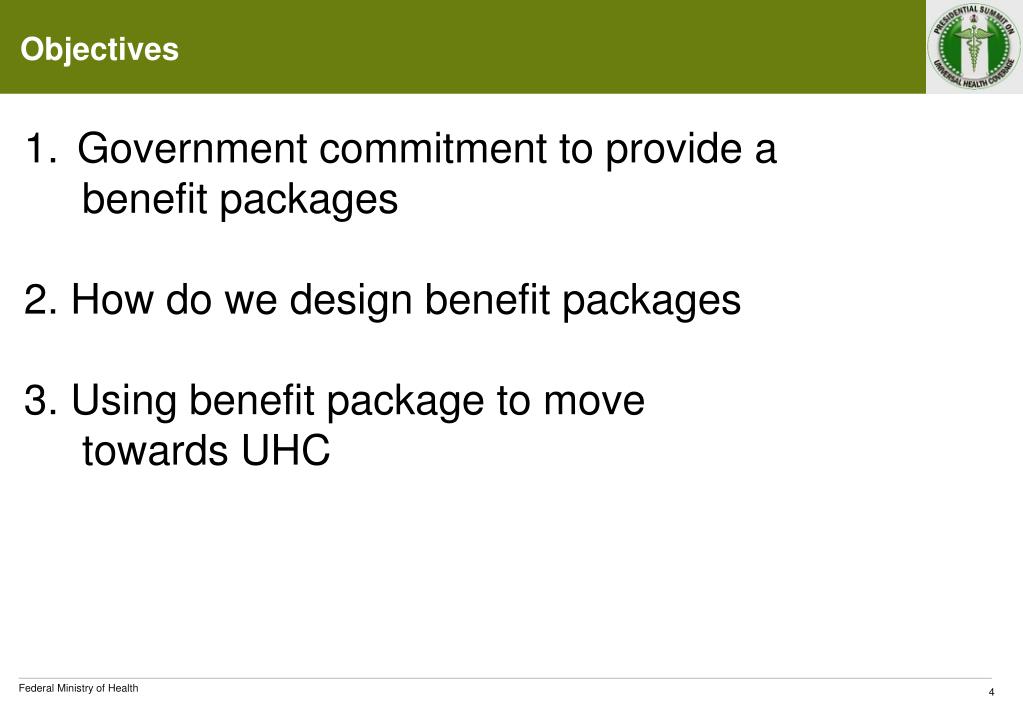 Objectives Government commitment to provide a benefit packages 2. How do we design benefit packages 3. Using benefit package to move towards UHC