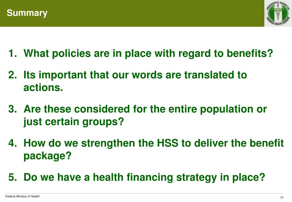 Summary What policies are in place with regard to benefits? Its important that our words are translated to actions. Are these considered for the entire population or just certain groups? How do westrengthen the HSS to deliver the benefit package? Do we have a health financing strategy in place?