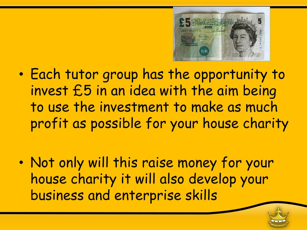 Each tutor group has the opportunity to invest £5 in an idea with the aim being to use the investment to make as much profit as possible for your house charity • Not only will this raise money for your house charity it will also develop your business and enterprise skills