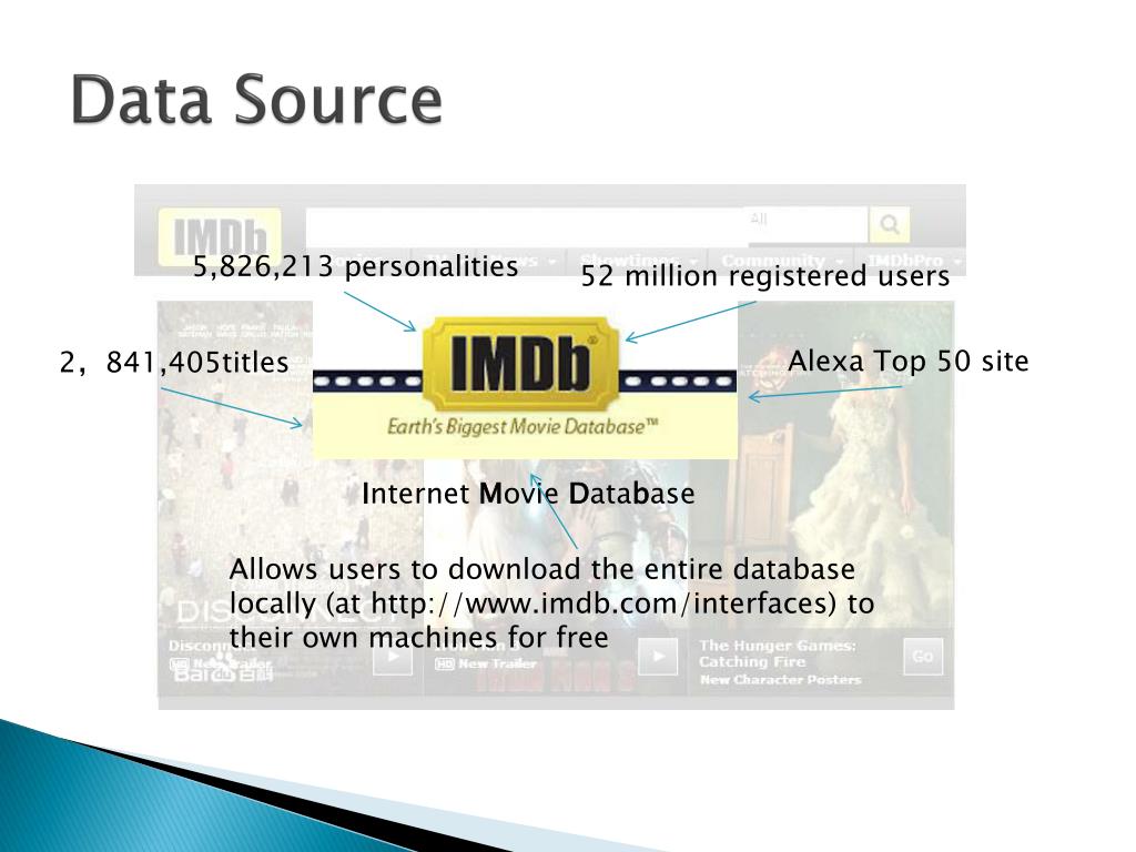 Data Source 5,826,213 personalities 52 million registered users 2,841,405titles Alexa Top 50 site Internet Movie Database Allows users to download the entire database locally (at http://www.imdb.com/interfaces) to their own machines for free