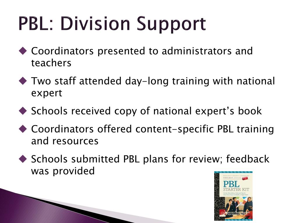 PBL: Division Support • Coordinators presented to administrators and teachers • Two staff attended day-long training with national expert • Schools received copy of national expert’s book • Coordinators offered content-specific PBL training and resources • Schools submitted PBL plans for review; feedback was provided