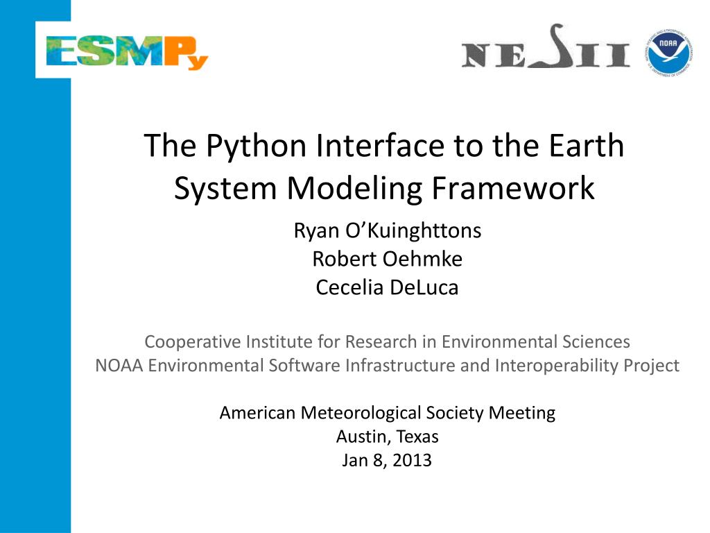 The Python Interface to the Earth System Modeling Framework. Ryan O ’ Kuinghttons Robert Oehmke Cecelia DeLuca Cooperative Institute for Research in Environmental Sciences NOAA Environmental Software Infrastructure and Interoperability Project American Meteorological Society Meeting