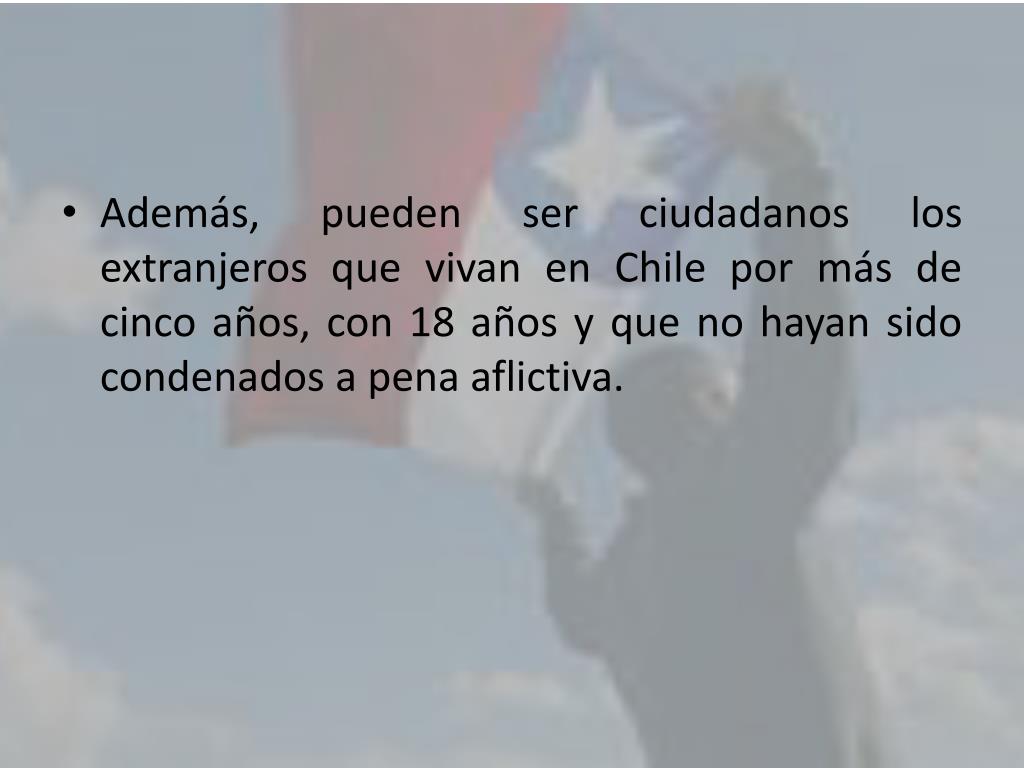 Además, pueden ser ciudadanos los extranjeros que vivan en Chile por más de cinco años, con 18 años y que no hayan sido condenados a pena aflictiva.