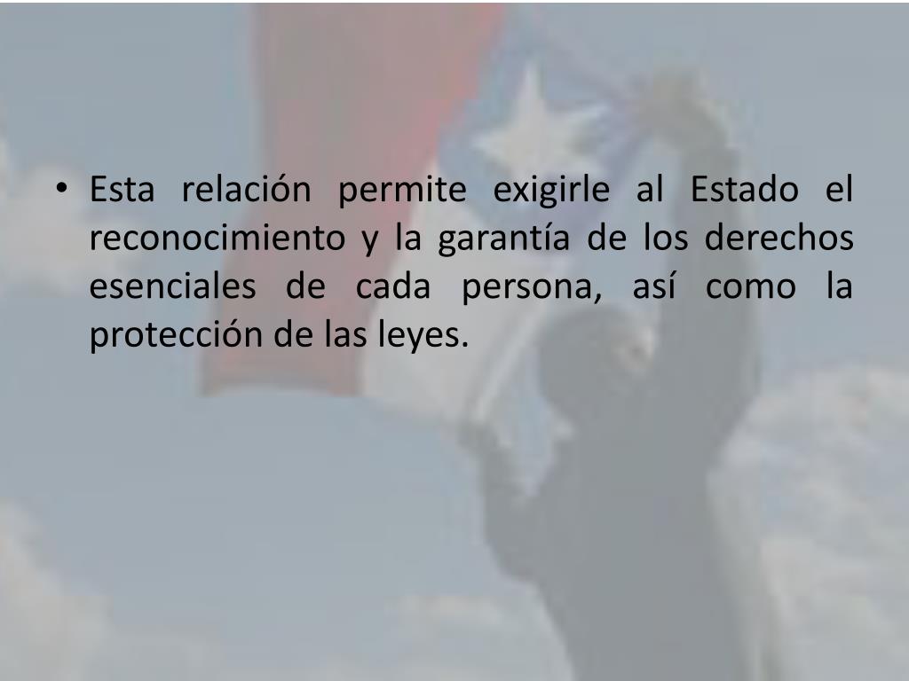 Esta relación permite exigirle al Estado el reconocimiento y la garantía de los derechos esenciales de cada persona, así como la protección de las leyes.