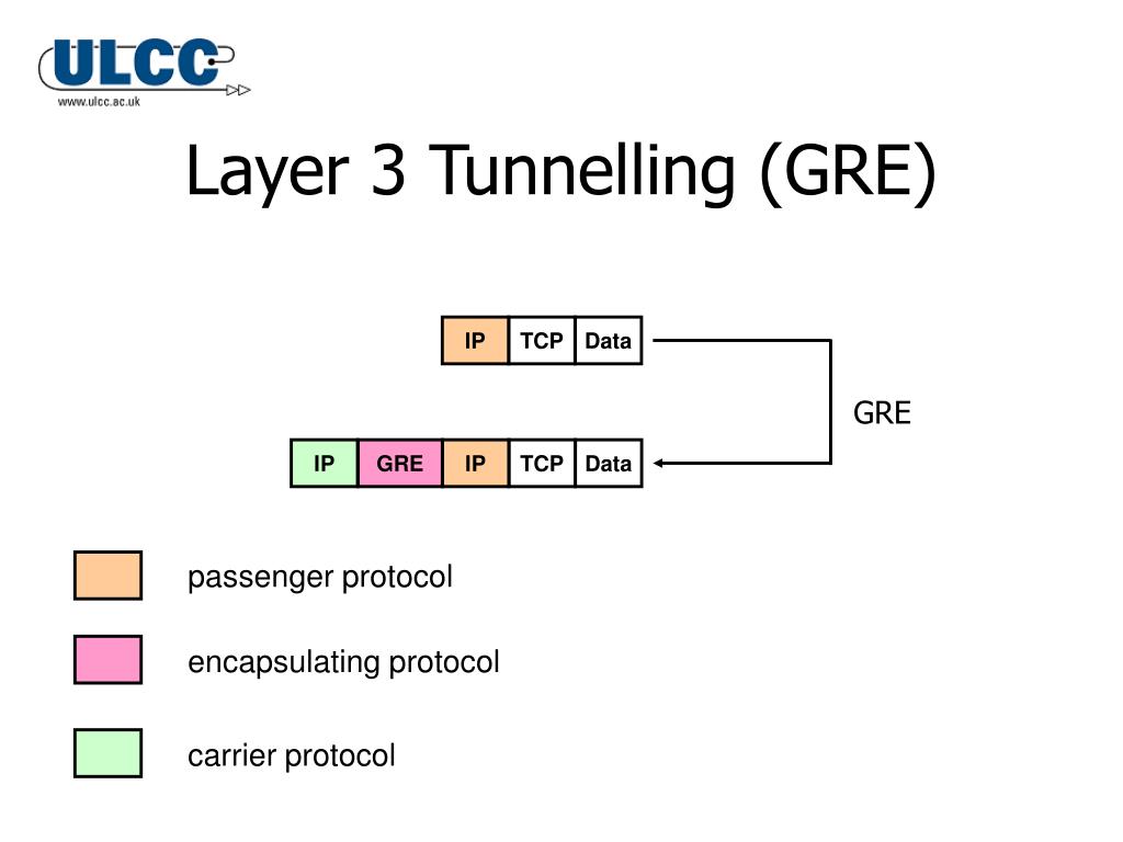 Layer 3 Tunnelling (GRE) IP TCP Data GRE IP GRE IP TCP Data passenger protocol encapsulating protocol carrier protocol