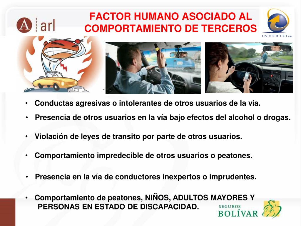 FACTOR HUMANO ASOCIADO AL COMPORTAMIENTO DE TERCEROS • Conductas agresivas o intolerantes de otros usuarios de la vía. • Presencia de otros usuarios en la vía bajo efectos del alcohol o drogas. • Violación de leyes de transito por parte de otros usuarios. • Comportamiento impredecible de otros usuarios o peatones. • Presencia en la vía de conductores inexpertos o imprudentes. • Comportamiento de peatones, NIÑOS, ADULTOS MAYORES Y PERSONAS EN ESTADO DE DISCAPACIDAD.