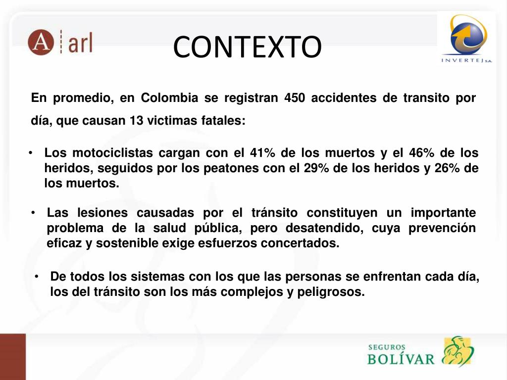CONTEXTO En promedio, en Colombia se registran 450 accidentes de transito por día, que causan 13 victimas fatales: • Los motociclistas cargan con el 41% de los muertos y el 46% de los heridos, seguidos por los peatones con el 29% de los heridos y 26% de los muertos. • Las lesiones causadas por el tránsito constituyen un importante problema de la salud pública, pero desatendido, cuya prevención eficaz y sostenible exige esfuerzos concertados. • De todos los sistemas con los que las personas se enfrentan cada día, los del tránsito son los más complejos y peligrosos.
