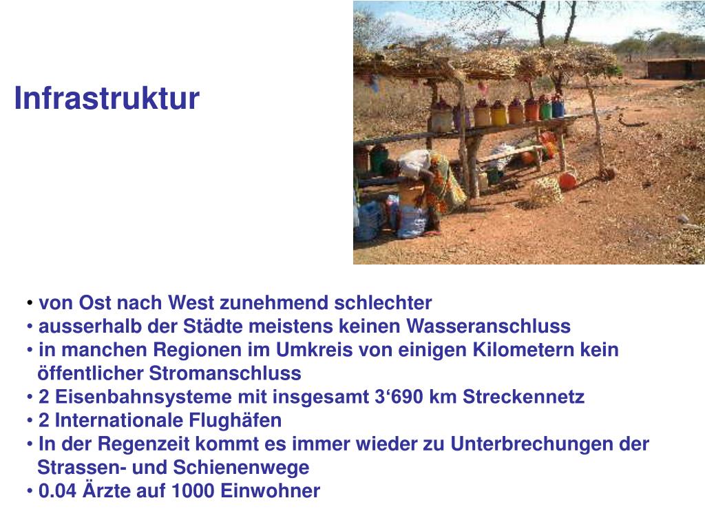 Infrastruktur • von Ost nach West zunehmend schlechter • ausserhalb der Städte meistens keinen Wasseranschluss • in manchen Regionen im Umkreis von einigen Kilometern kein • öffentlicher Stromanschluss • 2 Eisenbahnsysteme mit insgesamt 3‘690 km Streckennetz • 2 Internationale Flughäfen • In der Regenzeit kommt es immer wieder zu Unterbrechungen der • Strassen- und Schienenwege • 0.04 Ärzte auf 1000 Einwohner
