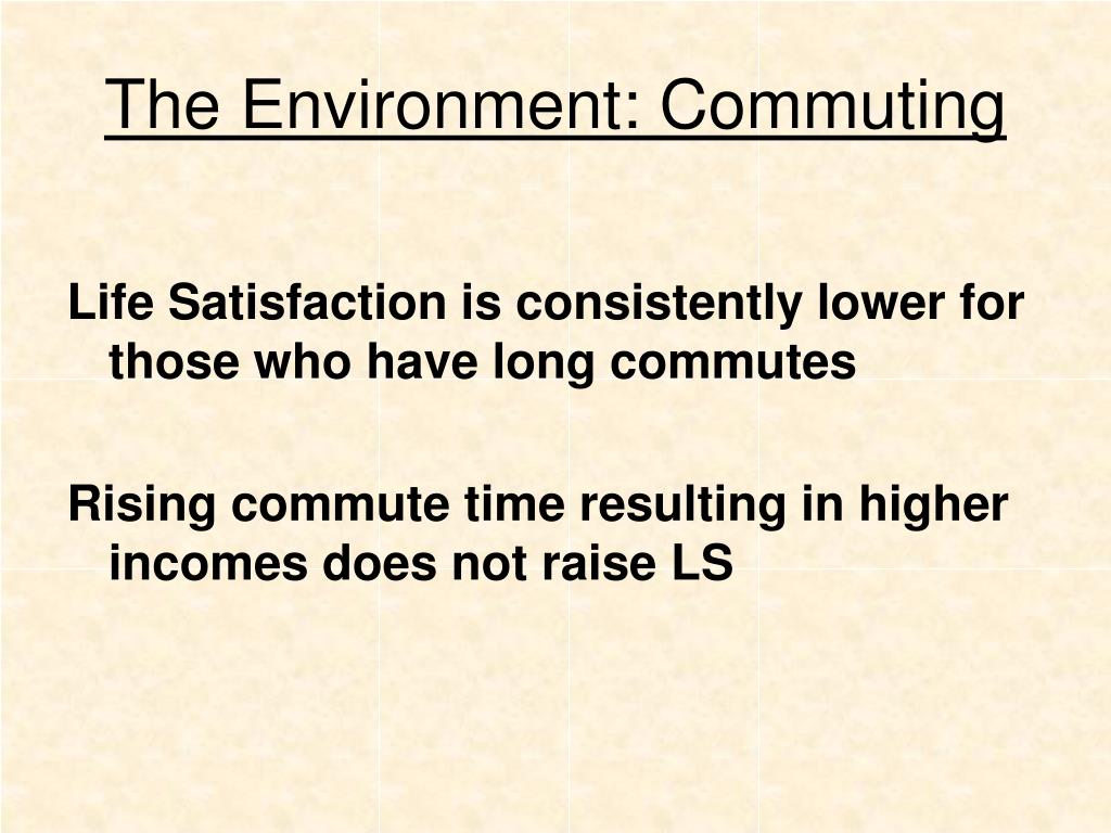 The Environment: Commuting Life Satisfaction is consistently lower for those who have long commutes Rising commute time resulting in higher incomes does not raise LS