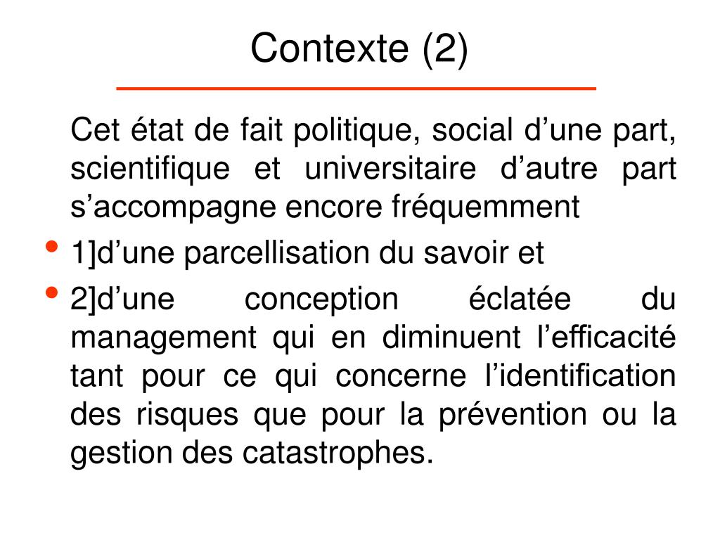 Contexte (2) Cet état de fait politique, social d’une part, scientifique et universitaire d’autre part s’accompagne encore fréquemment • 1]d’une parcellisation du savoir et • 2]d’une conception éclatée du management qui en diminuent l’efficacité tant pour ce qui concerne l’identification des risques que pour la prévention ou la gestion des catastrophes.