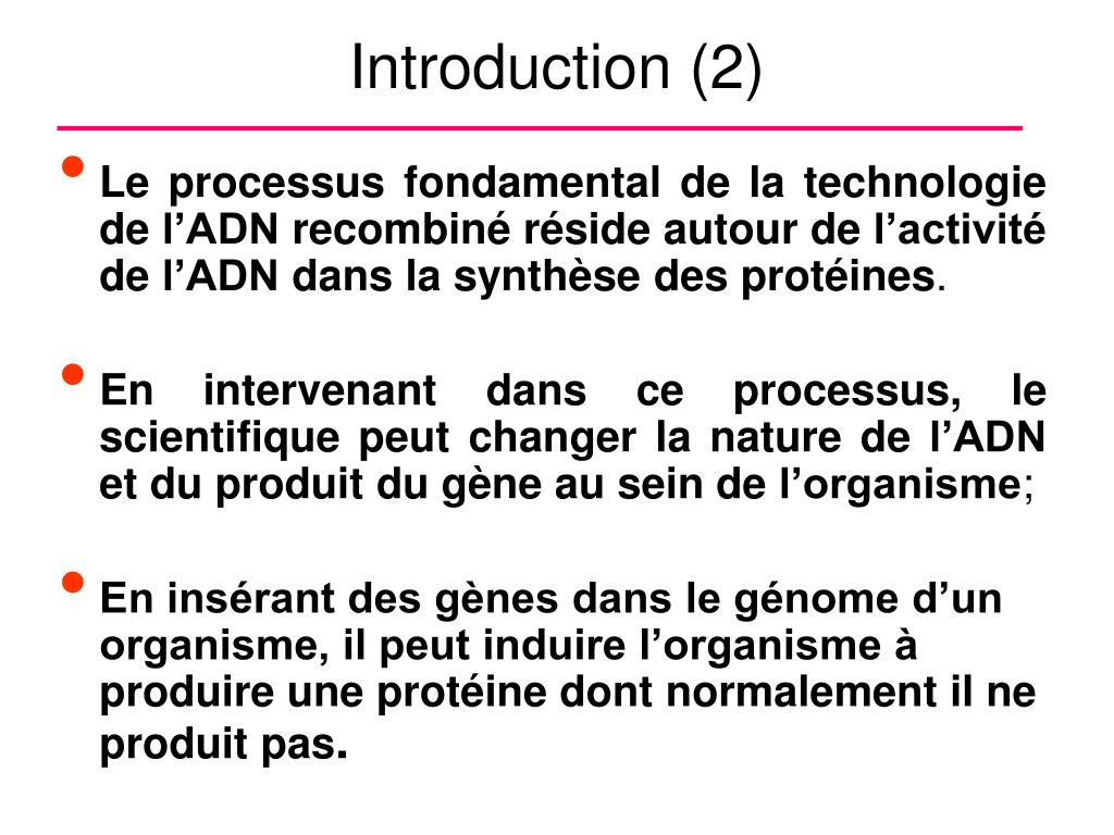 Introduction (2) • Le processus fondamental de la technologie de l’ADN recombiné réside autour de l’activité de l’ADN dans la synthèse des protéines. • En intervenant dans ce processus, le scientifique peut changer la nature de l’ADN et du produit du gène au sein de l’organisme; • En insérant des gènes dans le génome d’un organisme, il peut induire l’organisme à produire une protéine dont normalement il ne produit pas.