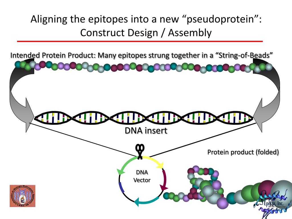 Aligning the epitopes into a new “pseudoprotein”: Construct Design / Assembly Intended Protein Product: Many epitopes strung together in a “String-of-Beads” DNA insert Protein product (folded) DNA Vector 32