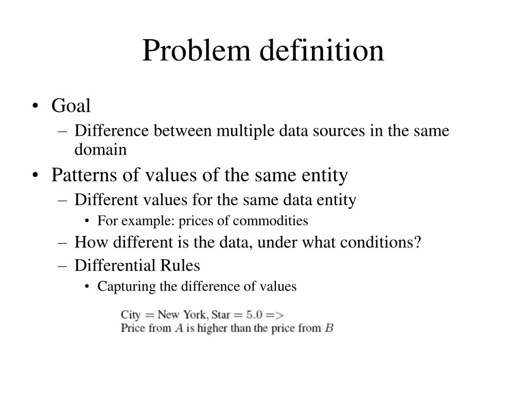 Problem definition • Goal • Difference between multiple data sources in the same domain • Patterns of values of the same entity • Different values for the same data entity • For example: prices of commodities • How different is the data, under what conditions? • Differential Rules • Capturing the difference of values
