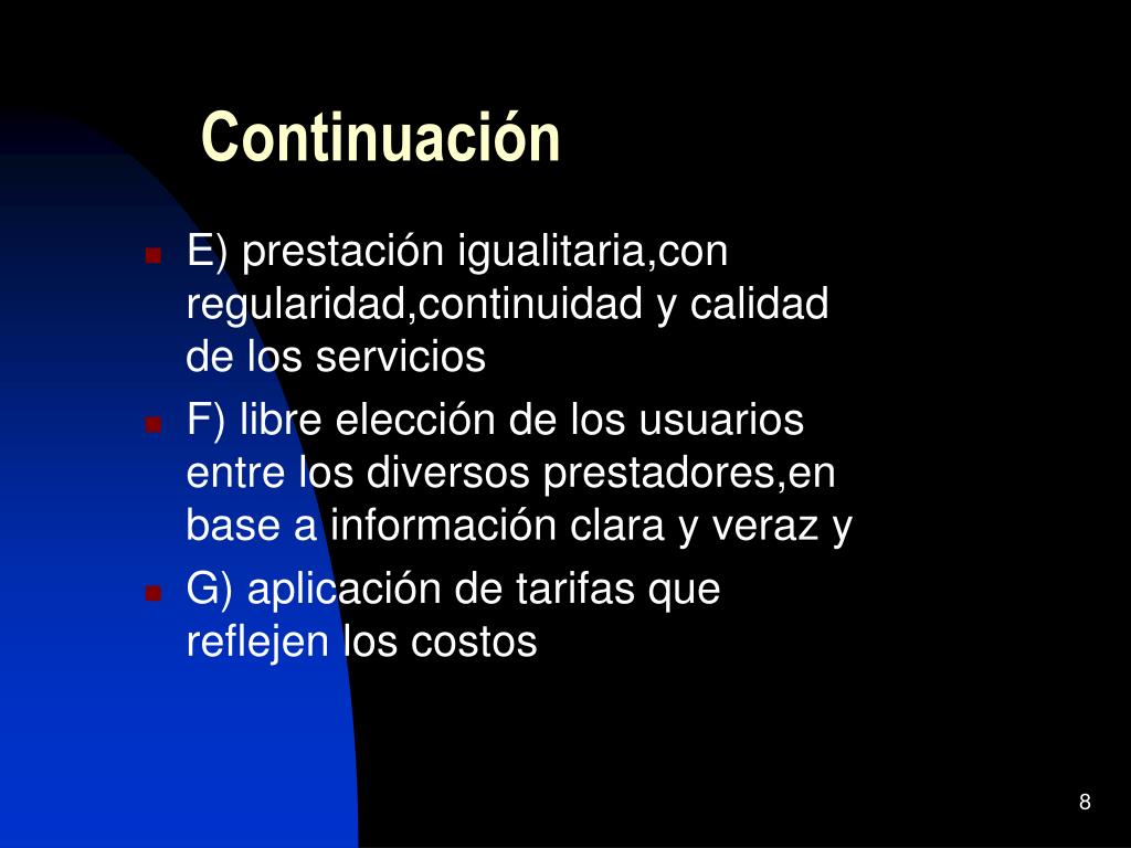 Continuación • E) prestación igualitaria,con regularidad,continuidad y calidad de los servicios • F) libre elección de los usuarios entre los diversos prestadores,en base a información clara y veraz y • G) aplicación de tarifas que reflejen los costos