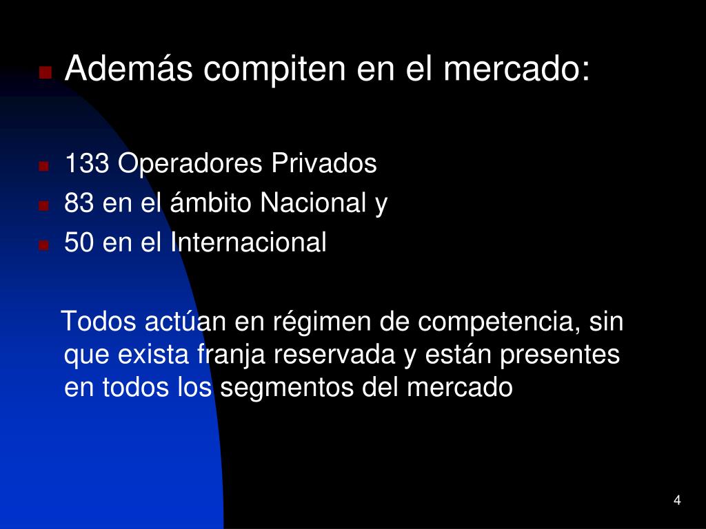 Además compiten en el mercado: • 133 Operadores Privados • 83 en el ámbito Nacional y • 50 en el Internacional Todos actúan en régimen de competencia, sin que exista franja reservada y están presentes en todos los segmentos del mercado