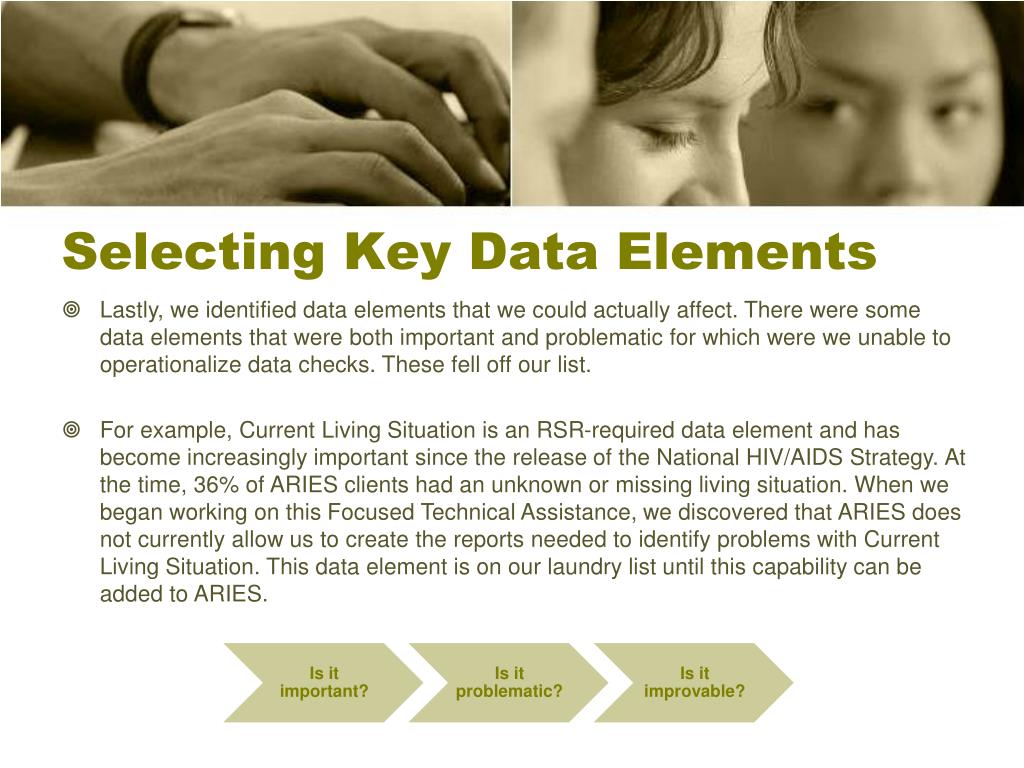 Selecting Key Data Elements • Lastly, we identified data elements that we could actually affect. There were some data elements that were both important and problematic for which were we unable to operationalize data checks. These fell off our list. • For example, Current Living Situation is an RSR-required data element and has become increasingly important since the release of the National HIV/AIDS Strategy. At the time, 36% of ARIES clients had an unknown or missing living situation. When we began working on this Focused Technical Assistance, we discovered that ARIES does not currently allow us to create the reports needed to identify problems with Current Living Situation. This data element is on our laundry list until this capability can be added to ARIES.