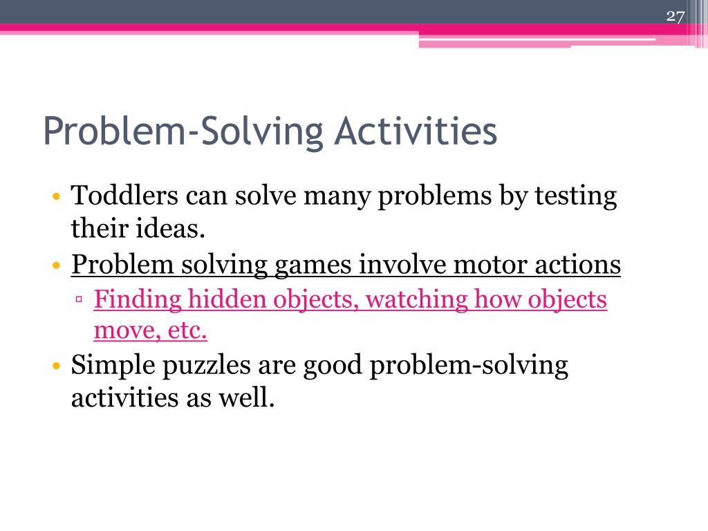 Problem-Solving Activities • Toddlers can solve many problems by testing their ideas. • Problem solving games involve motor actions • Finding hidden objects, watching how objects move, etc. • Simple puzzles are good problem-solving activities as well.