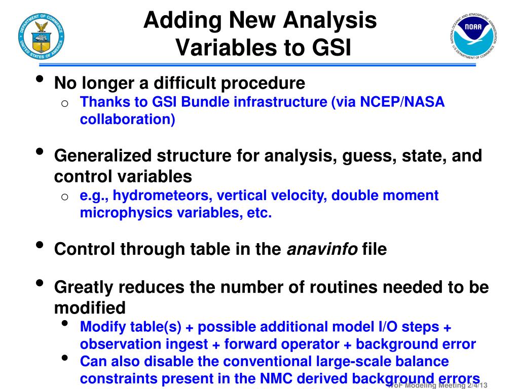Adding New AnalysisVariables to GSI • No longer a difficult procedure • Thanks to GSI Bundle infrastructure (via NCEP/NASA collaboration) • Generalized structure for analysis, guess, state, and control variables • e.g., hydrometeors, vertical velocity, double moment microphysics variables, etc. • Control through table in the anavinfo file • Greatly reduces the number of routines needed to be modified • Modify table(s) + possible additional model I/O steps + observation ingest + forward operator + background error • Can also disable the conventional large-scale balance constraints present in the NMC derived background errors