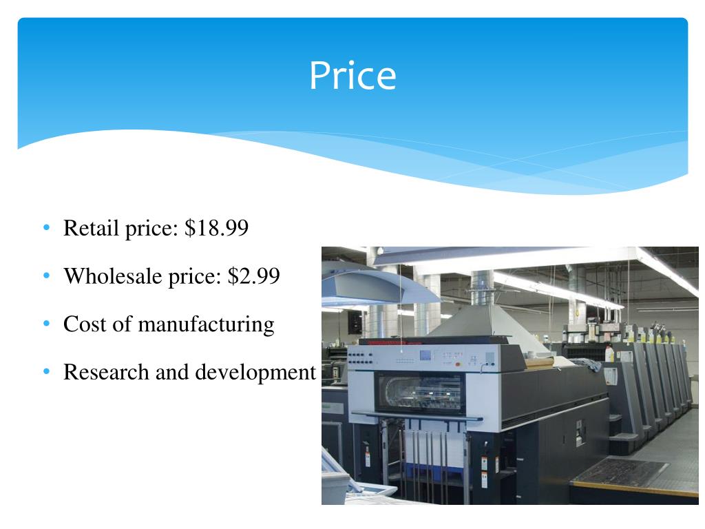 Price • Retail price: $18.99 • Wholesale price: $2.99 • Cost of manufacturing • Research and development