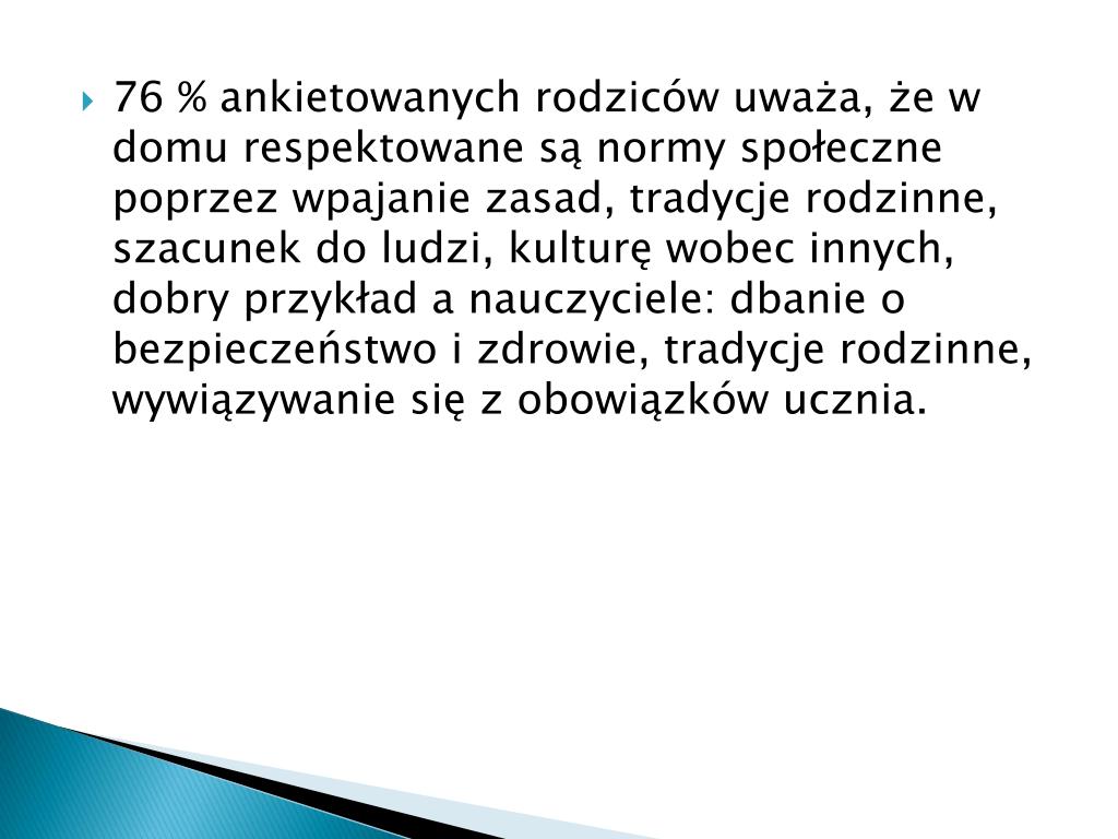 76 % ankietowanych rodziców uważa, że w domu respektowane są normy społeczne poprzez wpajanie zasad, tradycje rodzinne, szacunek do ludzi, kulturę wobec innych, dobry przykład a nauczyciele: dbanie o bezpieczeństwo i zdrowie, tradycje rodzinne, wywiązywanie się z obowiązków ucznia.