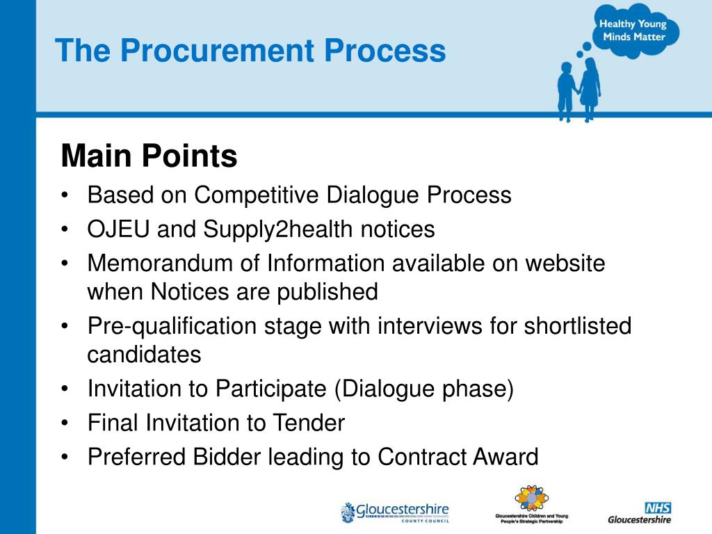 Healthy Young Minds Matter: The Procurement Process. John Fuller Assistant Director - Procurement NHS Gloucestershire September 2009. The Procurement Process. Main Points Based on Competitive Dialogue Process OJEU and Supply2health notices