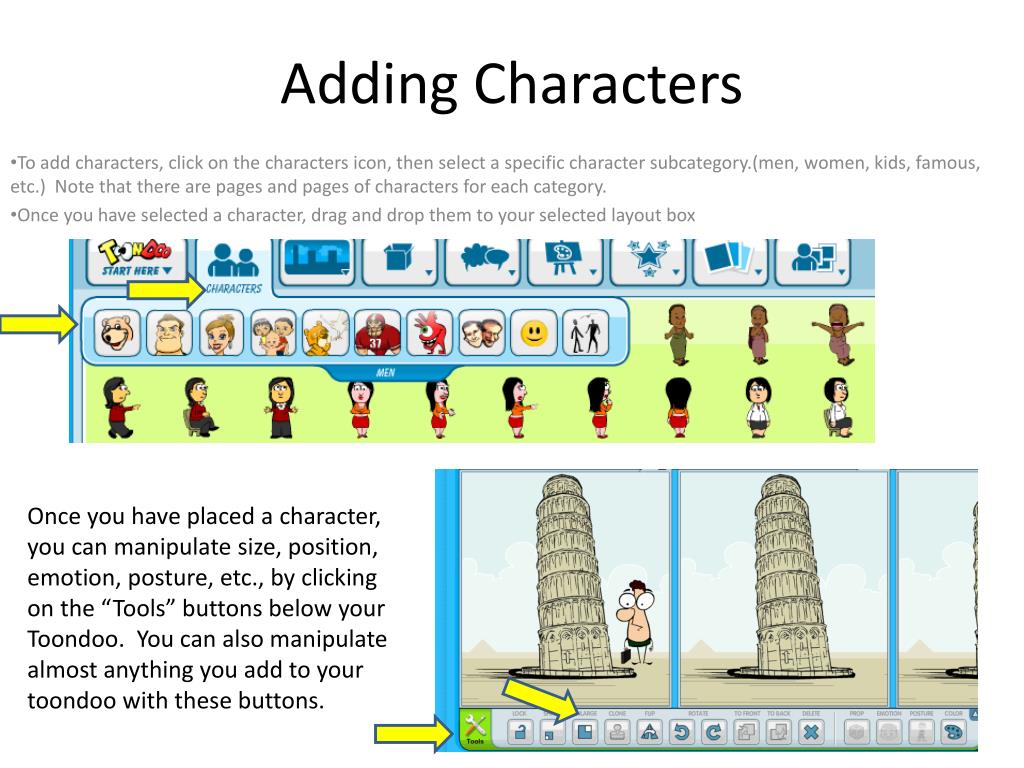 Adding Characters To add characters, click on the characters icon, then select a specific character subcategory.(men, women, kids, famous, etc.) Note that there are pages and pages of characters for each category. Once you have selected a character, drag and drop them to your selected layout box Once you have placed a character, you can manipulate size, position, emotion, posture, etc., by clicking on the “Tools” buttons below your Toondoo. You can also manipulate almost anything you add to your toondoo with these buttons.