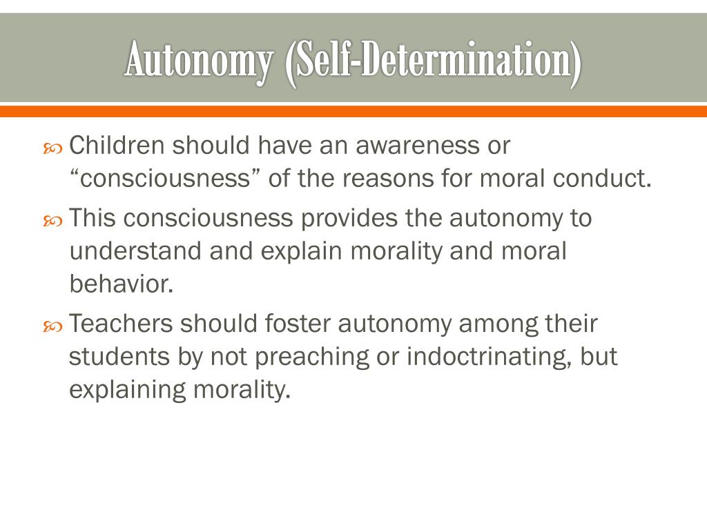Autonomy (Self-Determination) • Children should have an awareness or “consciousness” of the reasons for moral conduct. • This consciousness provides the autonomy to understand and explain morality and moral behavior. • Teachers should foster autonomy among their students by not preaching or indoctrinating, but explaining morality.