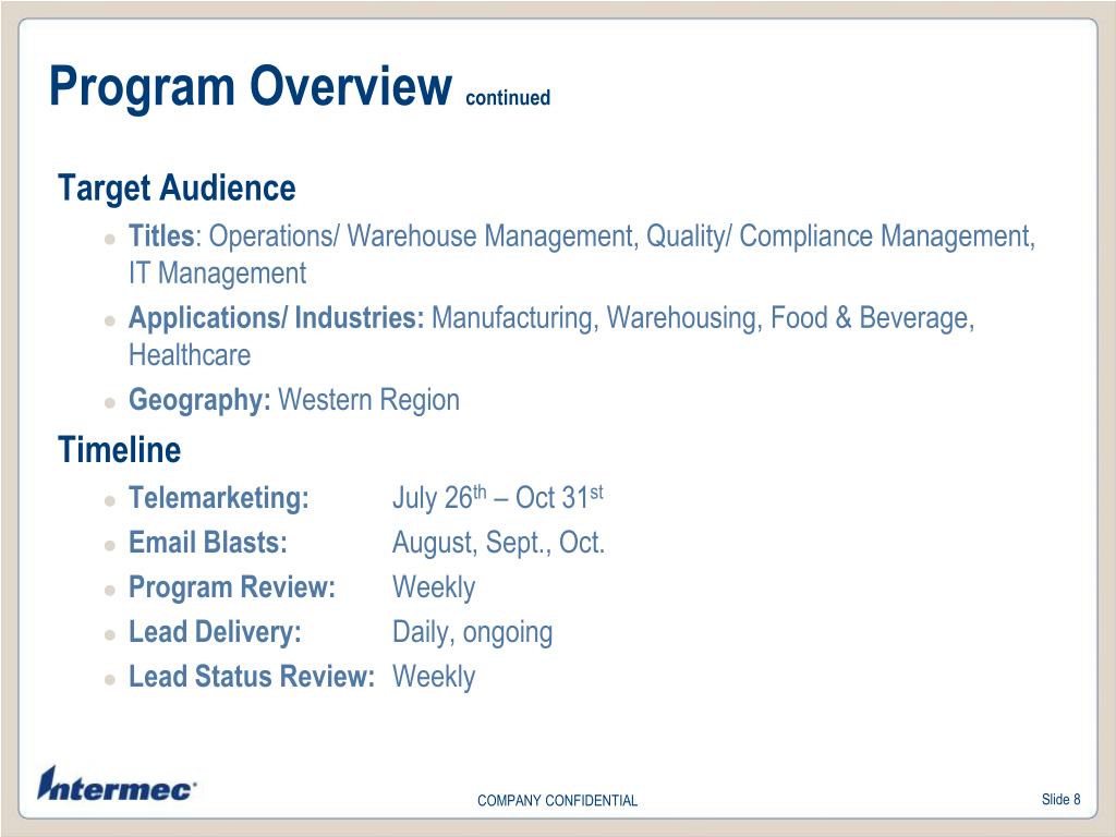 Program Overview continued Target Audience • Titles: Operations/ Warehouse Management, Quality/ Compliance Management, IT Management • Applications/ Industries: Manufacturing, Warehousing, Food & Beverage, Healthcare • Geography:Western Region Timeline • Telemarketing: July 26th – Oct 31st • Email Blasts:August, Sept., Oct. • Program Review: Weekly • Lead Delivery: Daily, ongoing • Lead Status Review: Weekly