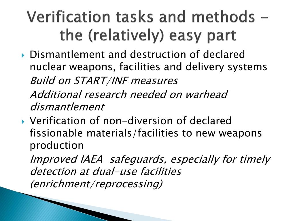 Verification tasks and methods - the (relatively) easy part • Dismantlement and destruction of declared nuclear weapons, facilities and delivery systems Build on START/INF measures Additional research needed on warhead dismantlement • Verification of non-diversion of declared fissionable materials/facilities to new weapons production Improved IAEA safeguards, especially for timely detection at dual-use facilities (enrichment/reprocessing)