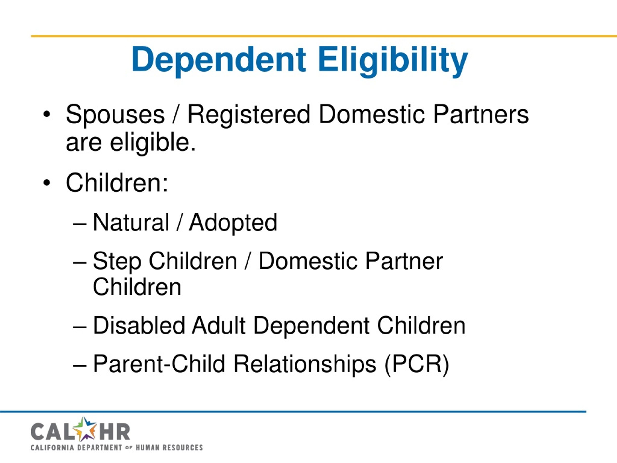 Spouses / Registered Domestic Partners are eligible. • Children: • Natural / Adopted • Step Children / Domestic Partner Children • Disabled Adult Dependent Children • Parent-Child Relationships (PCR) Dependent Eligibility