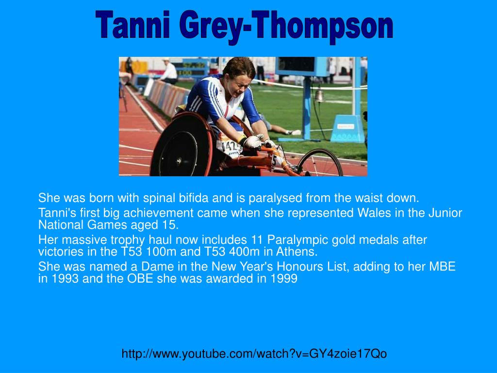 Tanni Grey-Thompson She was born with spinal bifida and is paralysed from the waist down. Tanni's first big achievement came when she represented Wales in the Junior National Games aged 15. Her massive trophy haul now includes 11 Paralympic gold medals after victories in the T53 100m and T53 400m in Athens. She was named a Dame in the New Year's Honours List, adding to her MBE in 1993 and the OBE she was awarded in 1999 http://www.youtube.com/watch?v=GY4zoie17Qo