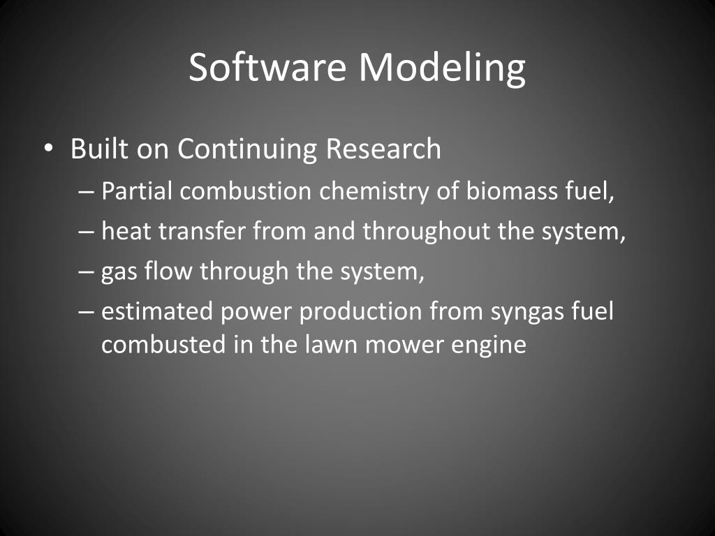Software Modeling • Built on Continuing Research • Partial combustion chemistry of biomass fuel, • heat transfer from and throughout the system, • gas flow through the system, • estimated power production from syngas fuel combusted in the lawn mower engine