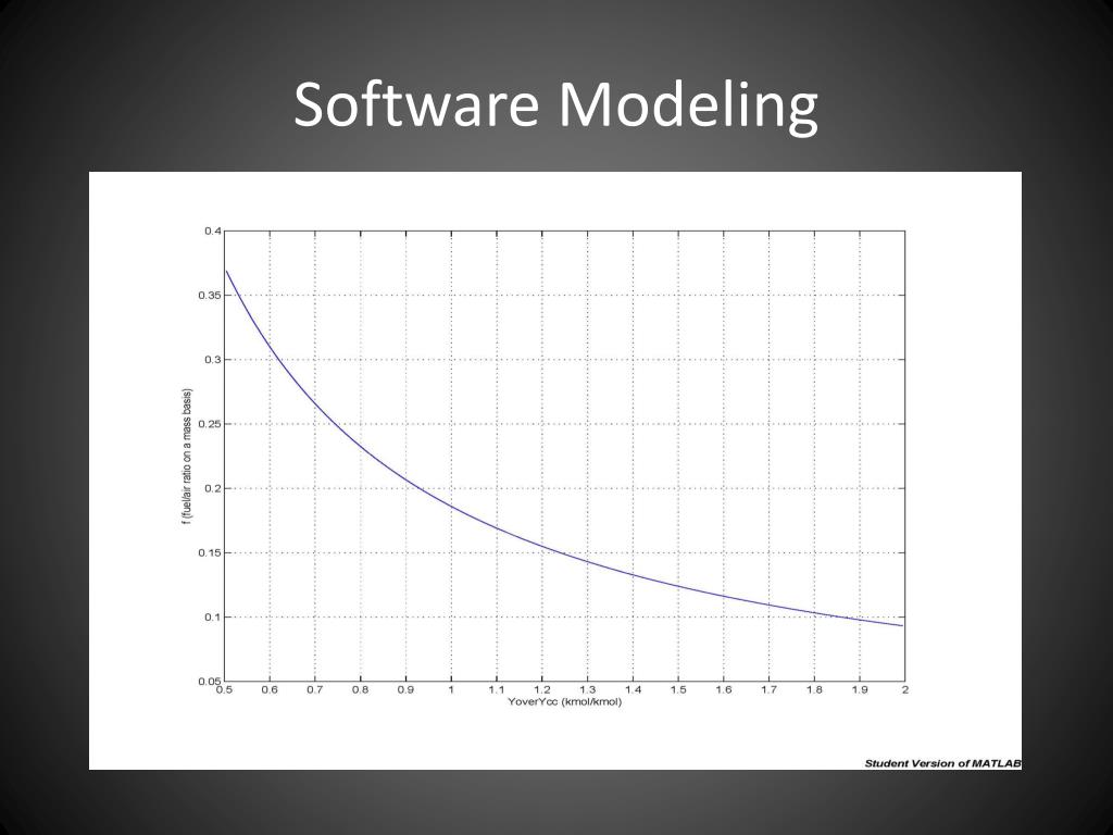 Software Modeling • Current model is of steady state, steady flow, 1st Law of Thermodynamics, excess fuel combustion gasifier of varying fuel-air ratios, which iterates for flame temperature based on • heat of combustion of (dry hickory wood) fuel, • Heat of reaction of CO + O2<==> CO2 • Enthalpies of products and reactants adjusted from adiabatic flame temperature to T of reactants