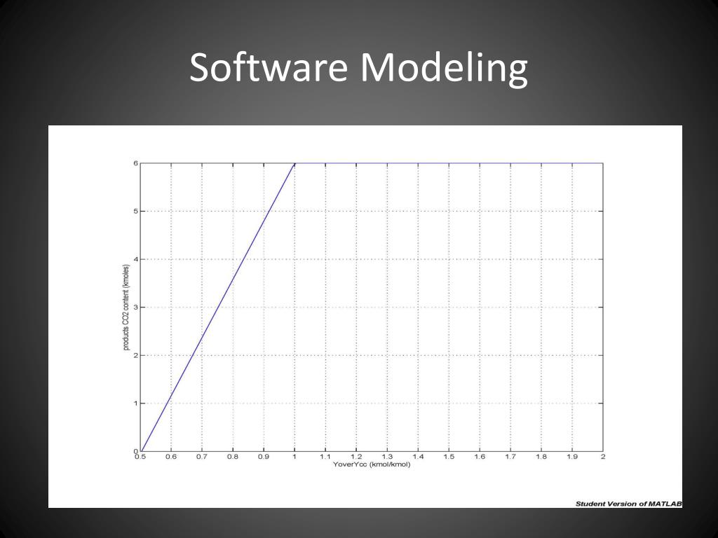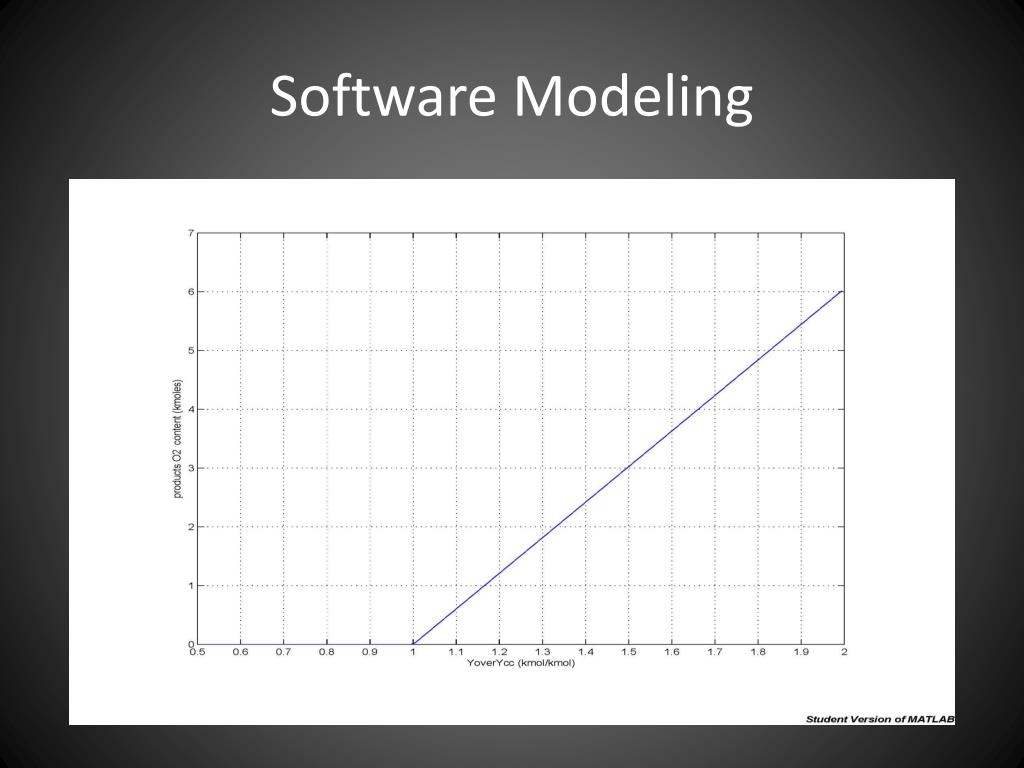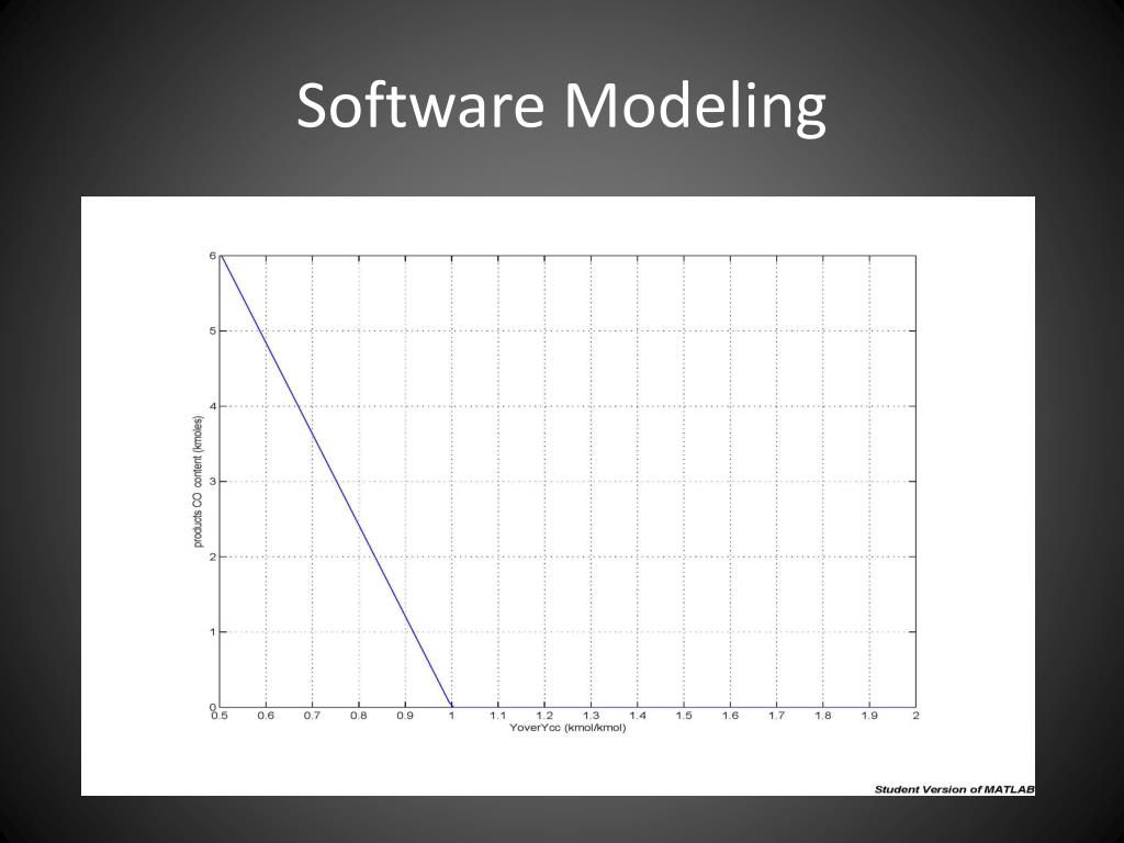 Software Modelling • Results-to-date: • Based on the combustion model, the team estimates that a high percentage of products output (60% theoretically) can be achieved with excess fuel conditions at low temperatures (600-800 C) as compared to stoichiometric air conditions, due to the lack of oxygen and inability of reaction mixture to produce CO2 in these conditions.