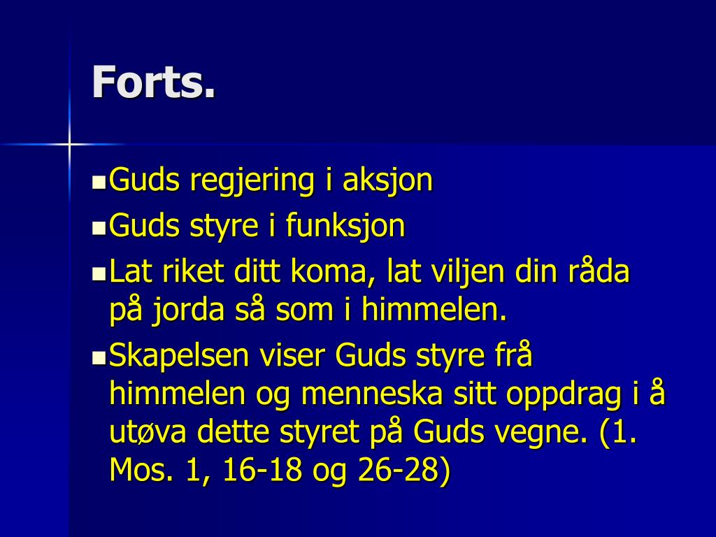 Forts. • Guds regjering i aksjon • Guds styre i funksjon • Lat riket ditt koma, lat viljen din råda på jorda så som i himmelen. • Skapelsen viser Guds styre frå himmelen og menneska sitt oppdrag i å utøva dette styret på Guds vegne. (1. Mos. 1, 16-18 og 26-28)