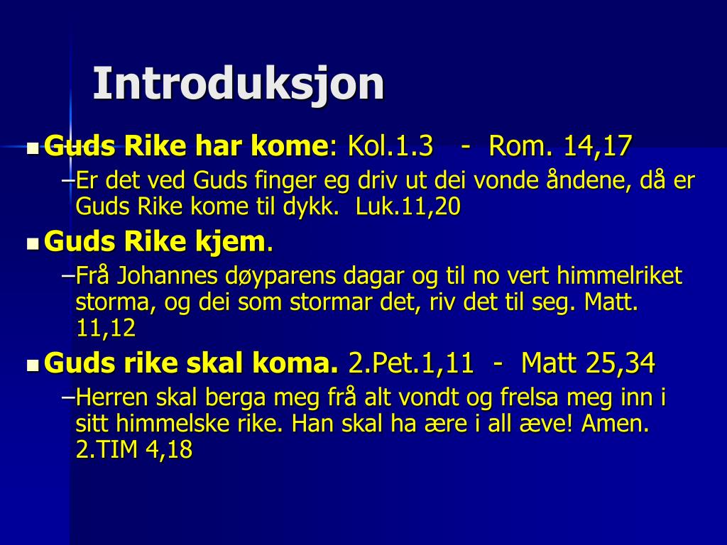 Introduksjon • Guds Rike har kome: Kol.1.3 - Rom. 14,17 • Er det ved Guds finger eg driv ut dei vonde åndene, då er Guds Rike kome til dykk. Luk.11,20 • Guds Rike kjem. • Frå Johannes døyparens dagar og til no vert himmelriket storma, og dei som stormar det, riv det til seg. Matt. 11,12 • Guds rike skal koma. 2.Pet.1,11 - Matt 25,34 • Herren skal berga meg frå alt vondt og frelsa meg inn i sitt himmelske rike. Han skal ha ære i all æve! Amen. 2.TIM 4,18